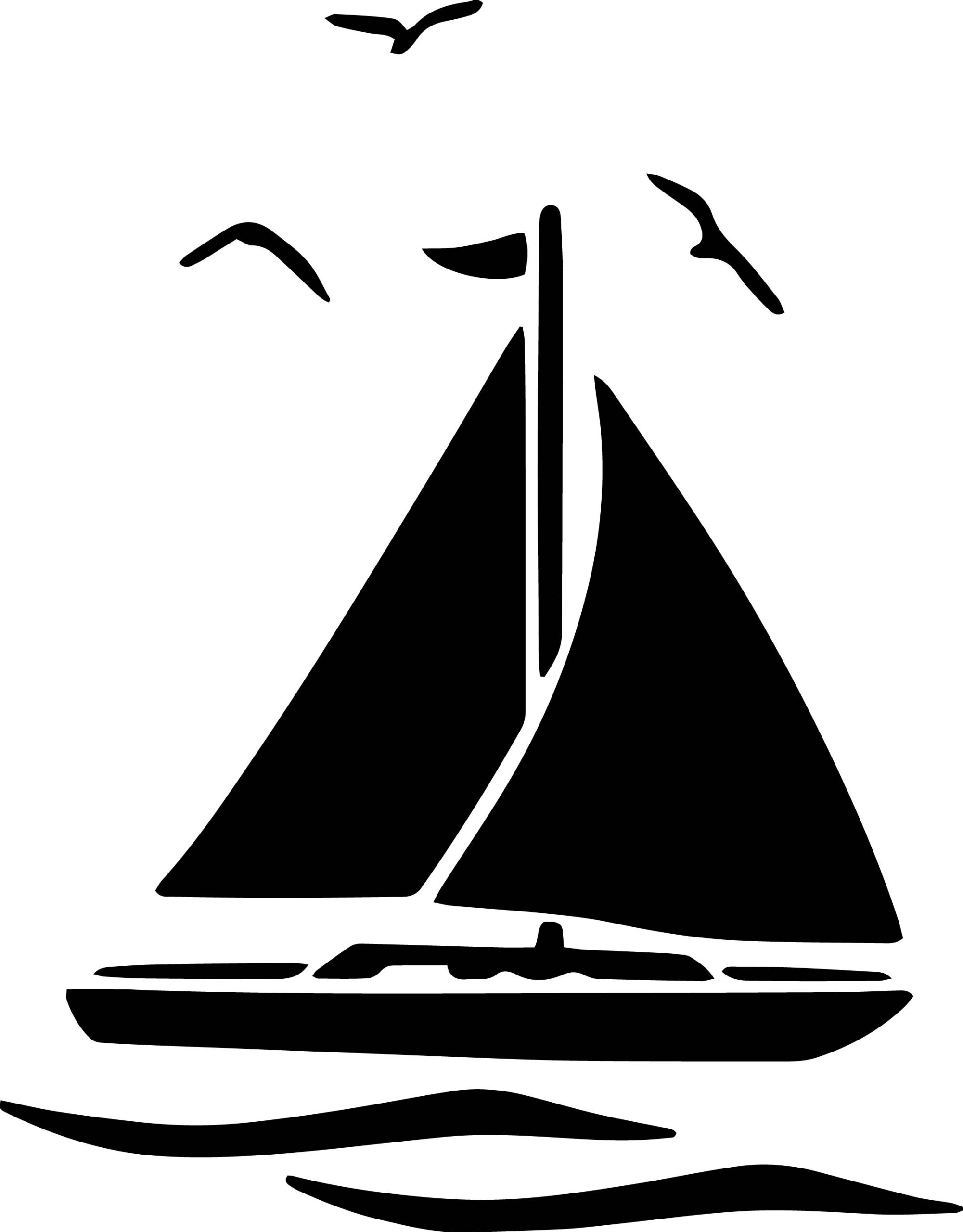 Nautical stencil featuring a sailboat and seagulls, perfect for decorating walls, wood, fabric, and sea-themed projects.