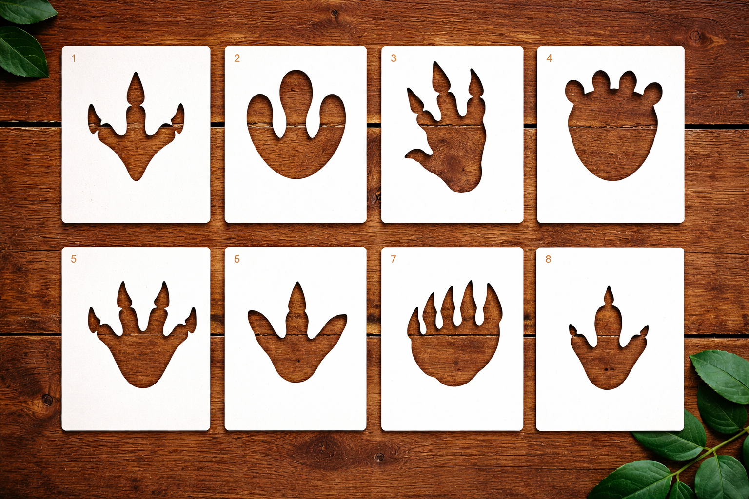 Dinosaur Footprint Stencil Set includes multiple prehistoric track designs, perfect for creating dinosaur trails and decorating kids’ rooms, playrooms, and creative DIY projects.