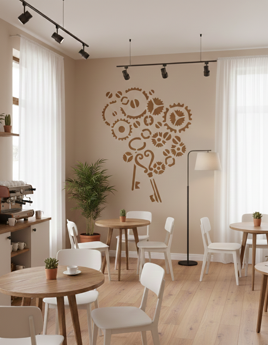 This Keys and Gears Stencil features a combined design of mechanical gear elements and key shapes arranged in a structured composition. The graphic layout is suitable for wall painting projects in offices, studios, workshops, or interiors inspired by industrial or steampunk themes.