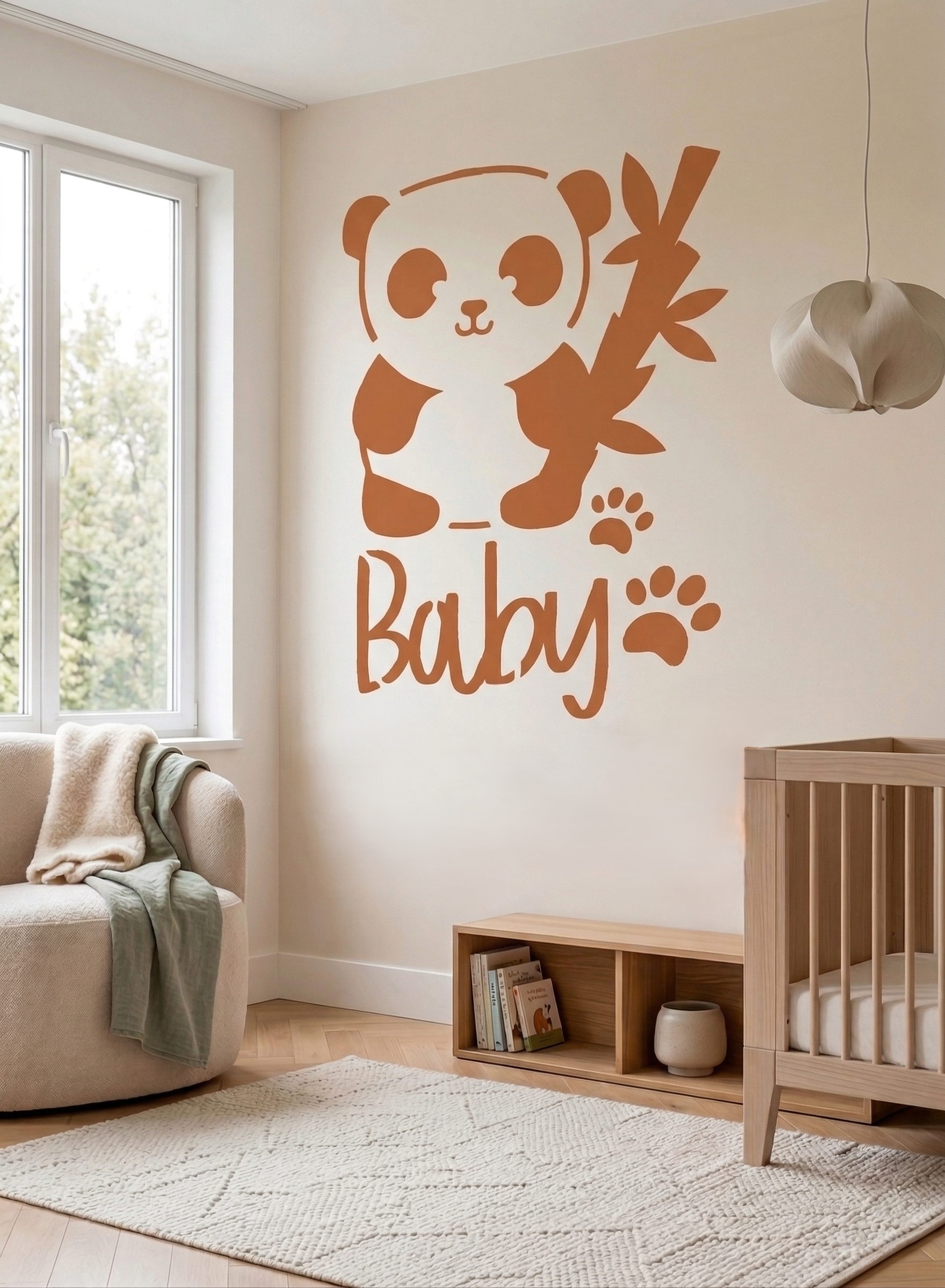 Dolce e giocoso design di panda con bambù, impronte di zampe e la parola “Baby” – perfetto per le pareti della cameretta, i mobili dei bambini o i progetti creativi per baby shower.
