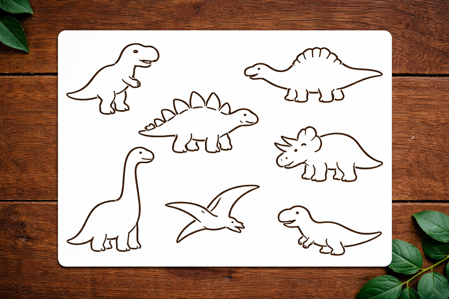 Setul de Șabloane Contur Dinozaur Desen Animat include mai multe modele prietenoase de dinozauri într-un stil simplu de contur, perfect pentru decorarea camerelor copiilor, a creșelor, a sălilor de joacă și a proiectelor creative DIY.