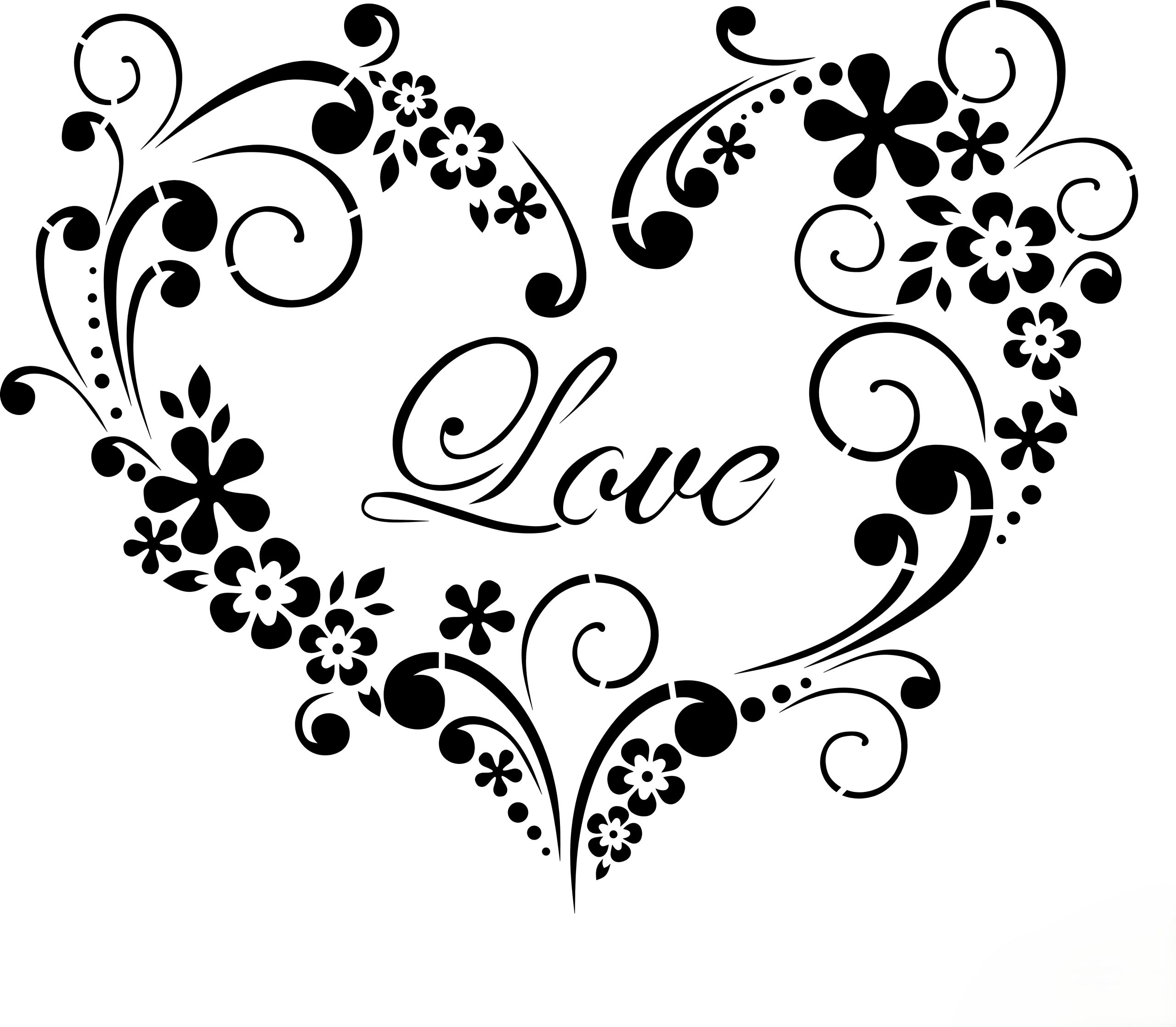 Floral Love Heart Stencil with an intricate heart shape made of flowers, swirls, and the word Love. Ideal for walls, furniture, fabrics, and DIY stencil projects.