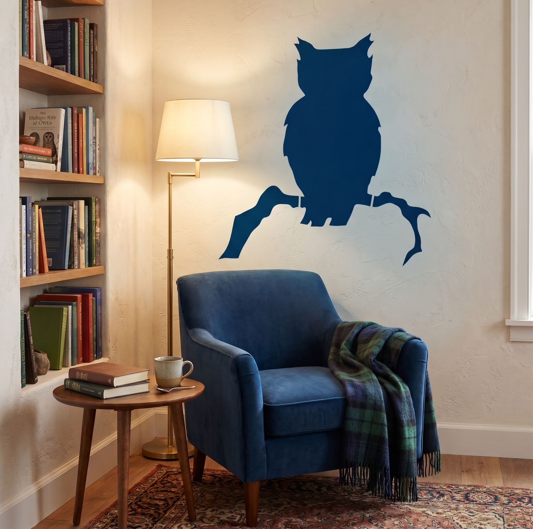 Šablona silhuete sove z elegantnim motivom sove na veji, idealna za DIY dekoracijo sten, pohištva, tkanin in ustvarjalnih projektov.